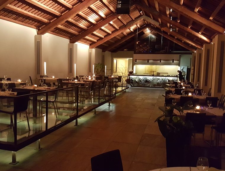 Il tetto in legno con travi a vista, ricostruito fedelmente così com'era nella vecchia cascina, insieme alle pedane in ferro e cristallo ed ai materiali lapidei utilizzati per la pavimentazione rendono nel loro insieme l'ambiente caldo ed elegante. Dai terrazzi la vista spazia dai boschi del Ticino al massiccio del Monte Rosa. Su un'intera parete della sala si staglia il fuoco vivo della griglia con la quale vengono preparati gran parte dei piatti che vengono serviti.